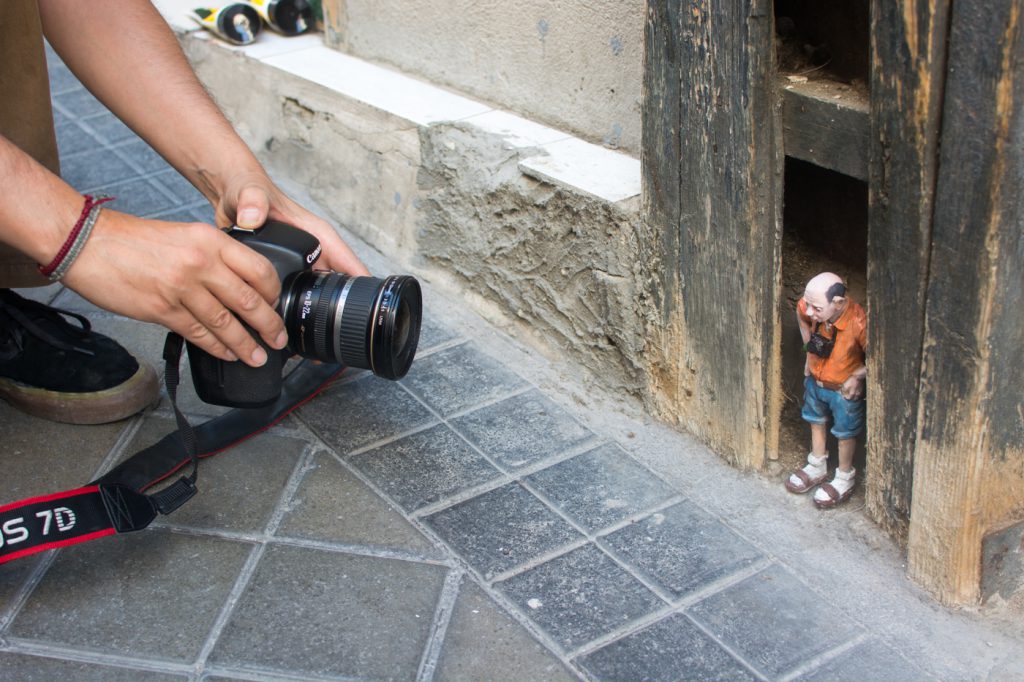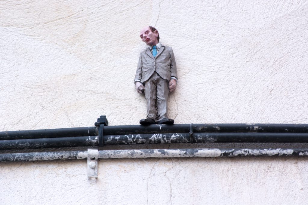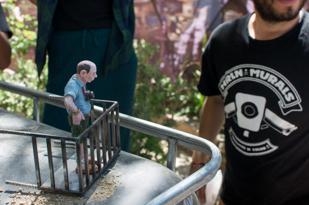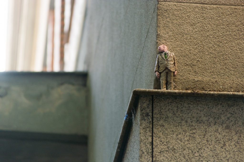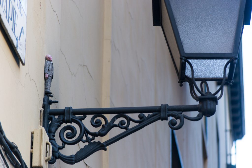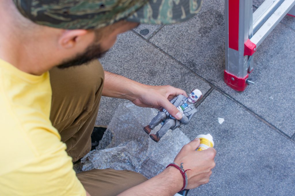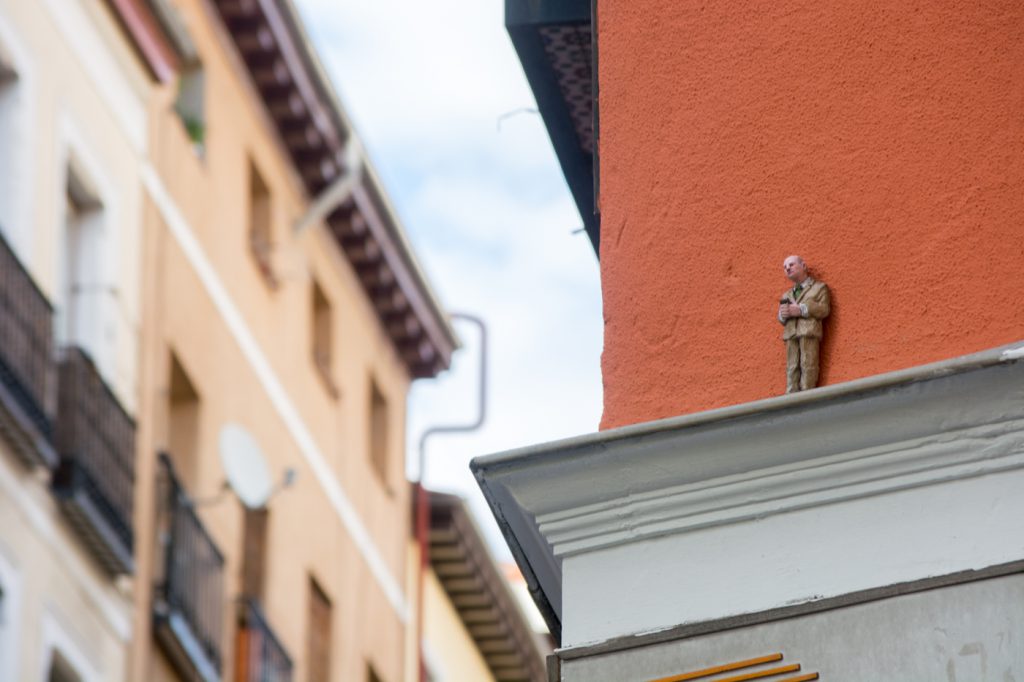 La sexta edición de C.A.L.L.E. Lavapiés nos permitió el lujo de contar con Isaac Cordal como artista invitado. Siguiendo la línea iniciada en 2018 con las intervenciones sobre mobiliario urbano de Aïda Gómez, quisimos volver a contar con un artista que mirase (y nos hiciese mirar) la ciudad de otra manera, a través de un trabajo alejado de la pintura mural y las intervenciones de gran formato, y cuyo descubrimiento en pequeños rincones, guiado probablemente por el azar, supusiese una nueva experiencia para el espectador, para el vecino, dentro de lo que hemos llamado arte urbano.