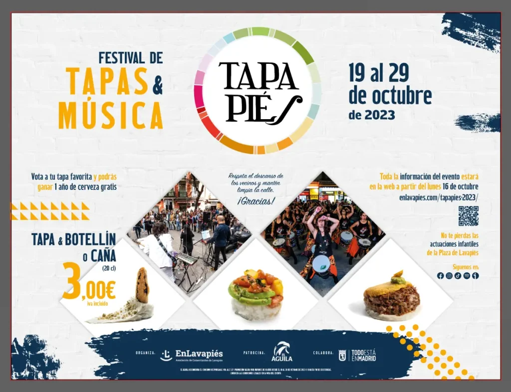 Ya estamos en pleno Tapapiés 2023, la edición 12+1, que viene llena de novedades, muchos premios, nuevas tapas y multitud de actuaciones musicales. ¡Nos vemos en Lavapiés del jueves 19 al domingo 29 de octubre! Y por favor recordad mantener limpia la calle, respetar el descanso de los vecinos y tanto disfrutar como cuidar del barrio y sus habitantes junt@s.