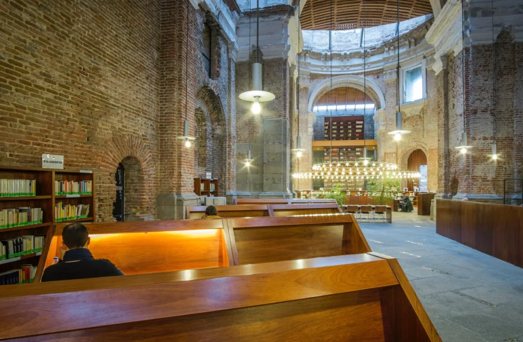 Tras lo contado en el punto anterior, la iglesia estuvo abandonada durante medio siglo, tras lo cual sus ruinas se rehabilitaron en forma de Biblioteca Universitaria del Centro Asociado a la UNED en Madrid. Toda esta reconstrucción fue obra del arquitecto J. I. Linazasoro entre los años 1996 y 1999, a la par que llevó a cabo una construcción de un aulario de nueva planta.