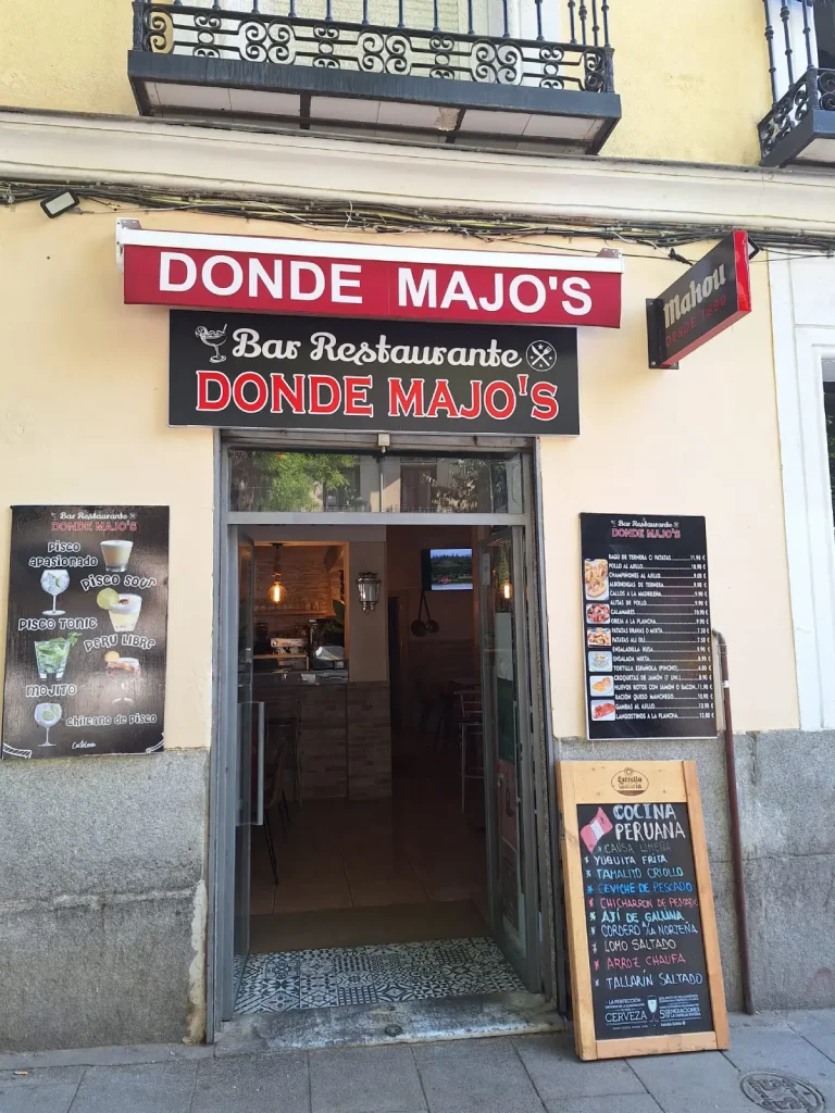Donde Majo’s, ubicado en la Calle de Argumosa en el vibrante barrio de Lavapiés, ofrece una experiencia gastronómica única que combina la cocina peruana con raciones españolas y cócteles típicos. El restaurante es conocido por su ambiente acogedor y un menú que destaca las ricas tradiciones culinarias tanto de Perú como de España. Los comensales pueden disfrutar de una variedad de platos peruanos, como ceviche, lomo saltado y ají de gallina, junto con raciones clásicas españolas como patatas bravas, jamón ibérico y tortilla española. La fusión de estas dos tradiciones culinarias se complementa con una gama de cócteles, que incluye opciones tradicionales como pisco sours y sangría. Donde Majo’s es celebrado por su ambiente vibrante y animado, lo que lo convierte en un lugar popular tanto para locales como para turistas que buscan experimentar un sabor de Perú y España en el corazón de Madrid.