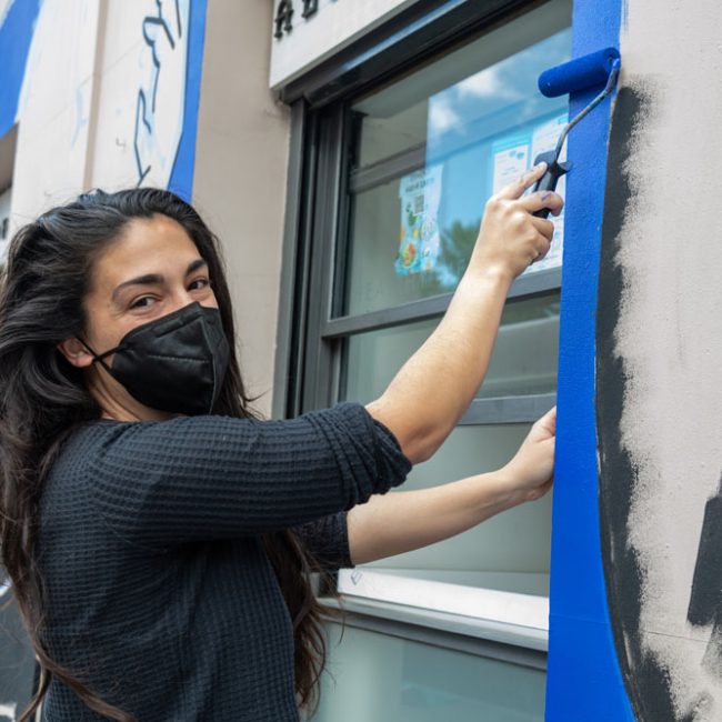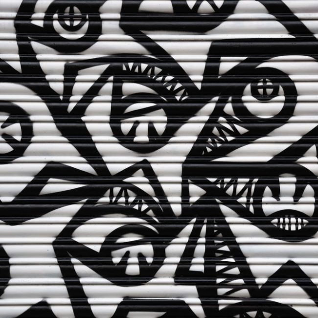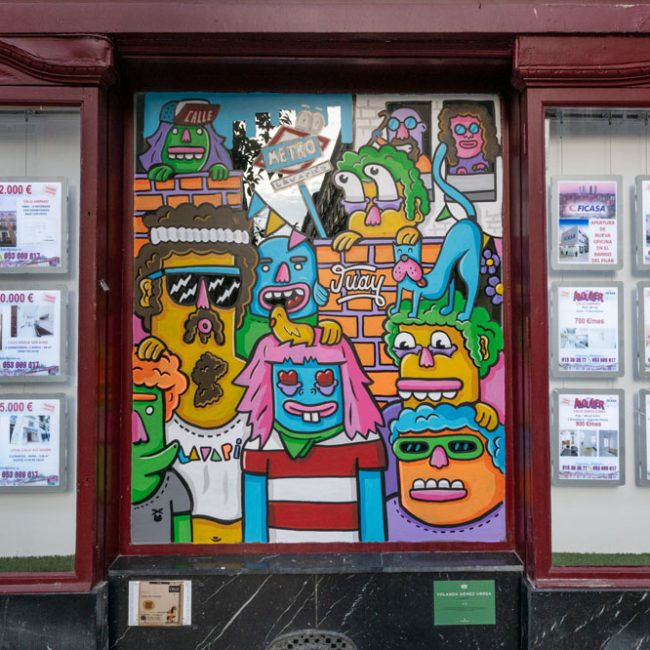 Y subiendo aún más esta calle encontramos la obra de Ase Torralba, en Tasca Barea (Rodas 2). «Rincones» consiste en una reinterpretación geométrica de los rincones de la tasca, que nos permite conocer el recorrido desde su origen hasta la actualidad. La gama cromática ha sido seleccionada tomando como referencia elementos que forman parte de su identidad como son los azulejos, sillas, marcos, su entorno o el propio vermú.