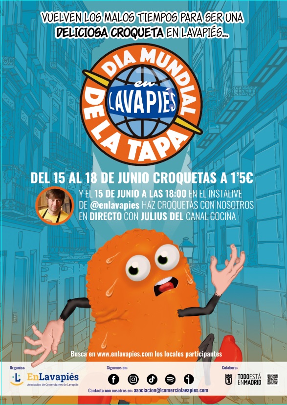 El undécimo aniversario del Día Mundial de la Tapa dará comienzo el jueves 15 de junio y durará hasta el domingo día 18. Se ha escogido como protagonista la croqueta, tapa típica española que no pasa nunca desapercibida. Cada restaurante servirá sus croquetas en su propio horario, que podrás consultar en la web y redes sociales de la Asociación de Comerciante de Lavapiés a partir del día 12.