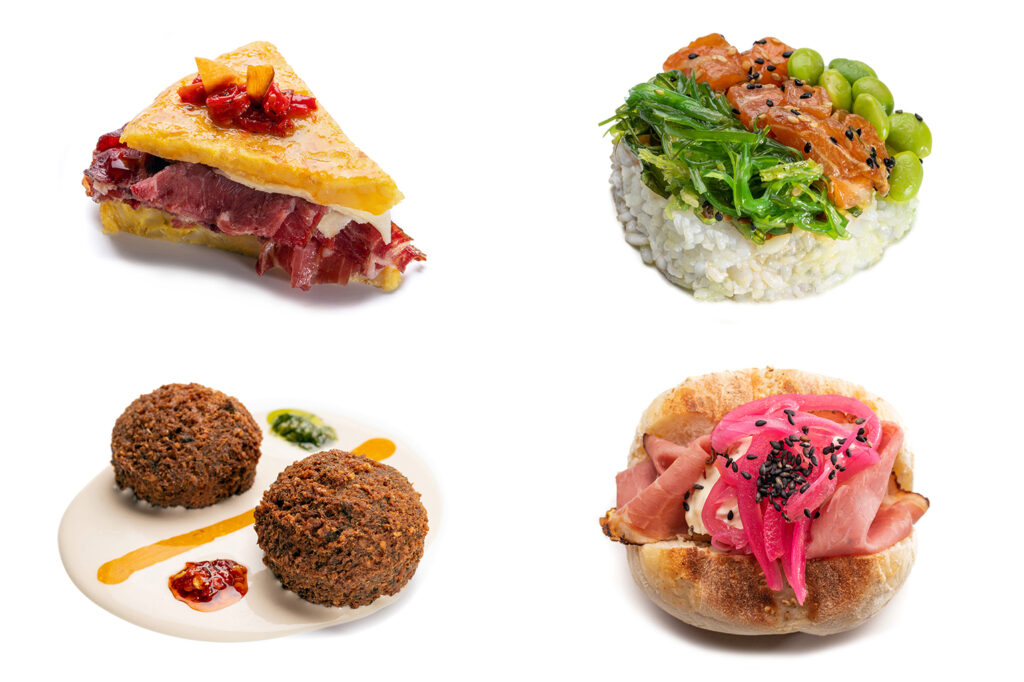 Entre otros, Brasil con Oriente Medio en la ‘tira gosto’ de Liber Arte Cantina Cultural (Ave María, 32), croqueta brasileira de trigo bulgur con ternera especiada. Aunque para Medio Oriente, la ‘falafel kaboon’ de Falafelería (Santa Isabel, 28), primera tapa de falafel que se recuerde, croqueta de garbanzos con salsa kaboon (mayonesa, yogur y especias verdes). Y para fusión… la canario-portuguesa-coreana ‘mi papa brava’ de Latazo (Mercado de Antón Martín), bolinho de papa con mojo hervido de kimchi, elaborado en aceite, caldo de verdura y sabrosa salsa picante Sriracha.