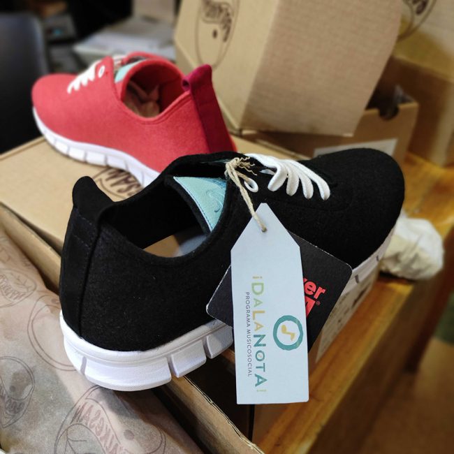 Y a partir de la semana que viene, en Calzados Vinigon, tienda emblemática de Lavapiés, de la mano de María Jesús, otra de nuestras empresarias más veteranas del barrio, podrás hacerte con las primeras zapatillas solidarias DaLaNota. Una colaboración con la marca de calzado vegano Ecoalkesan, que se ha propuesto dar una herramienta de empoderamiento y cambio social a este programa del barrio de Lavapiés con el fin de conseguir la transformación social también, a través de este calzado ecológico y activista. Su precio es de 49,50€ y todos los beneficios van dirigidos a financiar el Programa Musicosocial DaLaNota. La marca Ecoalkesan no recibe ningún tipo de beneficio, apoyando de esta manera al pequeño comercio como Vinigon y a una causa social como la de DaLaNota.