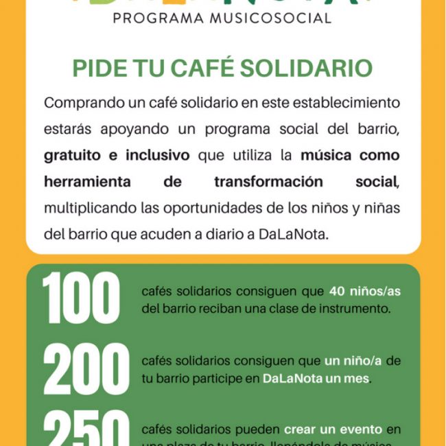 Gracias a esas incansables ganas de mejorar y ayudar a los demás, se han convertido en un referente en el barrio y ahora más que nunca necesitan nuestra ayuda. Actualmente nos han planteado nuevos retos con el fin de garantizar la continuidad del programa, tan necesario en el barrio. Nosotros no nos hemos podido aguantar y junto con dos de nuestros empresarios de Lavapiés hemos querido sumarnos a sus notas, con campañas como la que está teniendo lugar en O Pazo de Lugo, “PIDE TU CAFÉ SOLIDARIO POR 1€”, por la que comprando un café solidario en este establecimiento estarás apoyando a muchos niños y niñas del barrio que acuden a diario a DaLaNota sigan pudiendo disfrutar de este programa gratuito y llenar de música sus vidas.