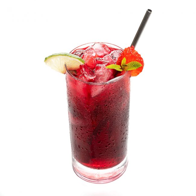 Black is Black: Cóctel atrevido y alegre con una exótica mezcla de Vodka negro, fresa, lima, hielo y soda.