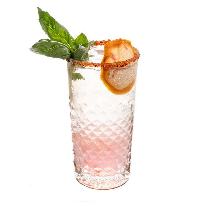 Paloma Albahaca: Tequila, cordial de albahaca y pomelo, triple sec, tónica de pomelo, borde de tajín.