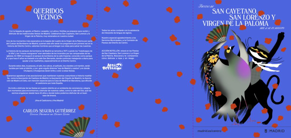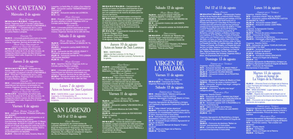 Las Fiestas de la Paloma pondrán el broche final los días 14 y 15 de agosto, en el barrio de La Latina. Los vecinos del barrio se visten de chulapos y chulapas, se escucha y baila el chotis en las calles y los bares. Hay actividades tradicionales como la procesión de la virgen, la famosa verbena, los concursos de mantones de manila, las degustaciones de platos típicosconciertos de todo tipo de estilos musicales en escenarios al aire libre y barras que los bares sacan a la calleLa procesión de la Virgen de la Paloma es el día 15 de agosto a las 20:00 partiendo de la Iglesia de la Paloma.